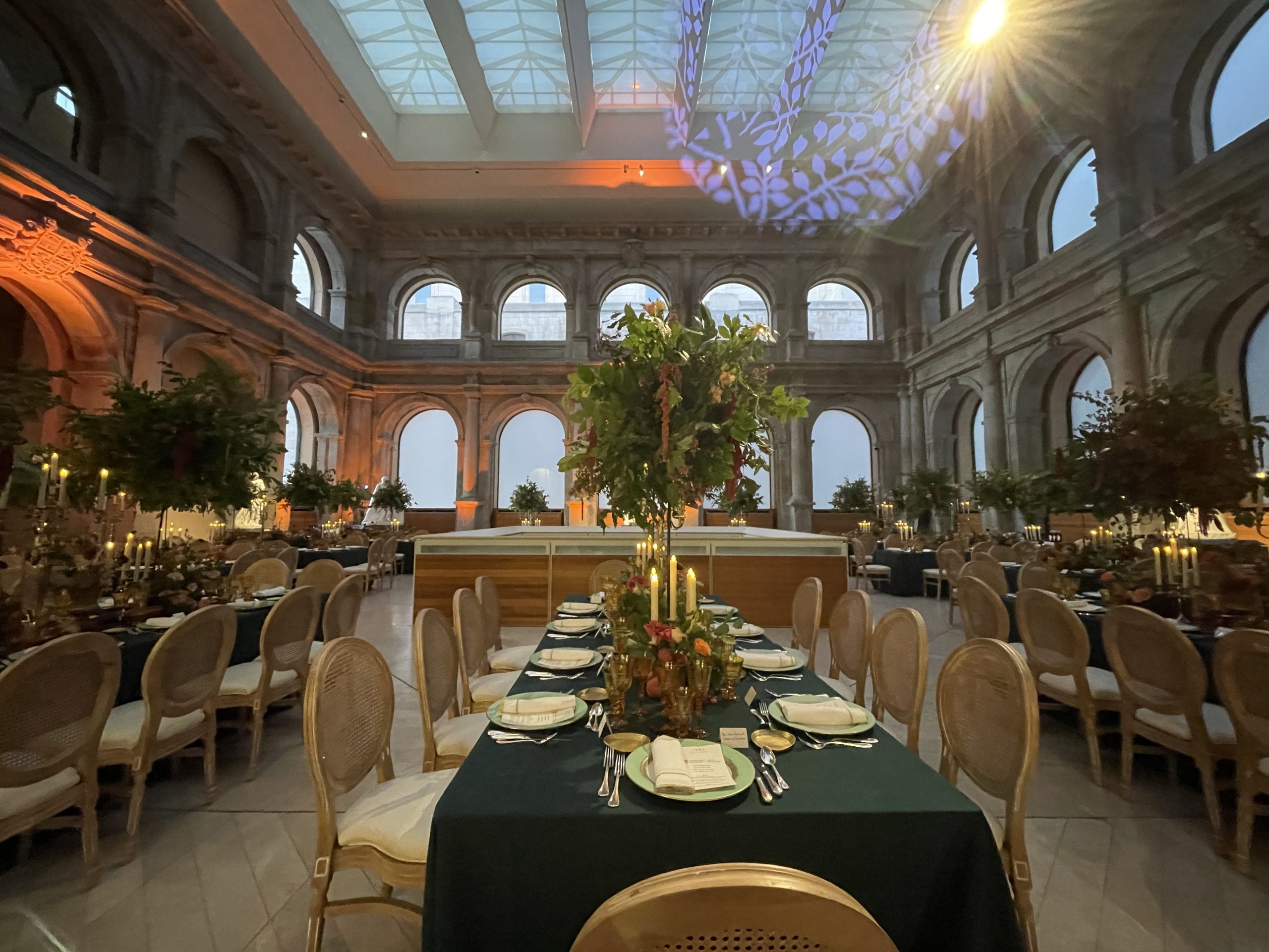 Bajo la imponente arquitectura del Claustro de los Jerónimos, los invitados disfrutaron de una puesta en escena espectacular: mesas vestidas con manteles verde oscuro, copas de cristal ámbar y una decoración floral exuberante que combinaba frutas, velas y centros elevados que parecían fundirse con la altura del espacio. Cada detalle estaba diseñado para sorprender y envolver a los asistentes en un ambiente sofisticado y acogedor.
