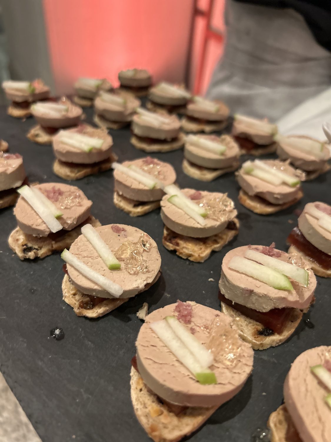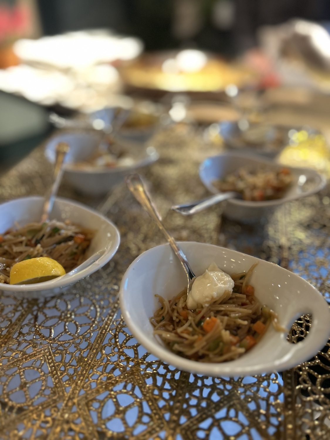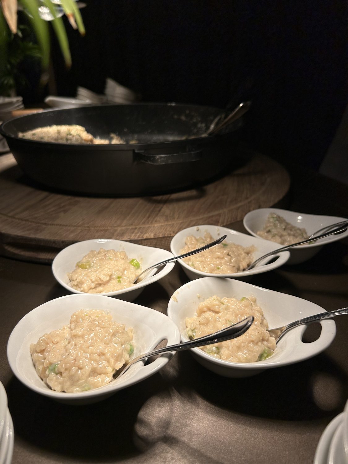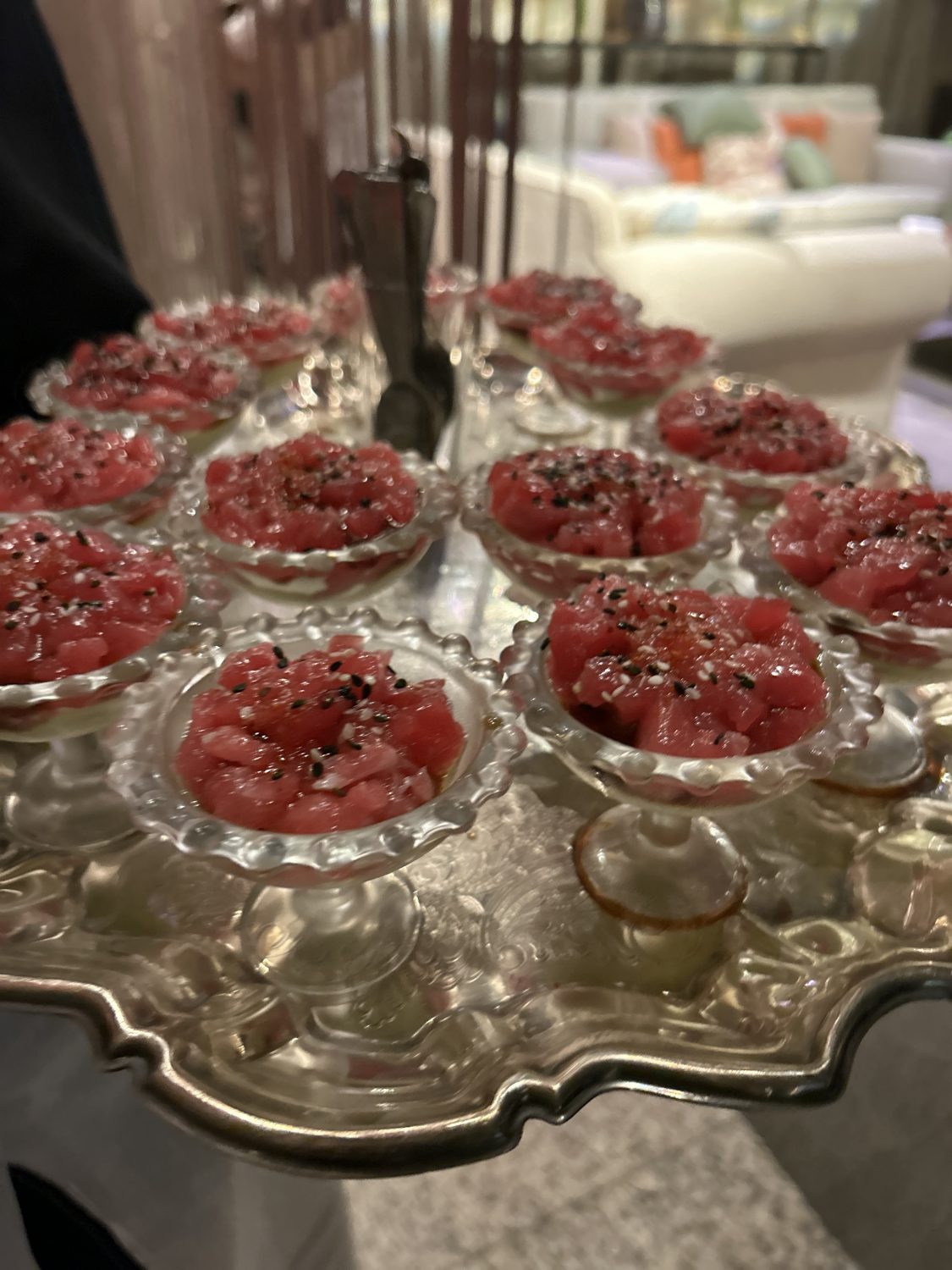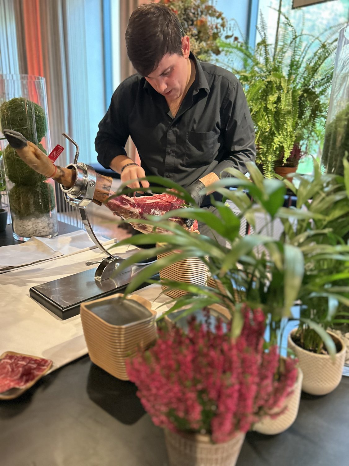 Tras un cóctel largo, el banquete sorprendió con un principal delicioso: «Wonton de rabo de toro, que les pareció a los invitados un principal muy original». Los postres alternativos como fueron el pastel ruso con coulis de fruta de la pasión y frutos rojos y el espectacular cremoso de mascarpone con salsa de café de Colombia invitaron a compartir y probar distintos sabores, mientras el salón, elegantemente decorado, acogía uno de los momentos más especiales de la boda: la entrada de los novios bajando las escaleras bailando junto a sus testigos, con un espectacular juego de luces. La atención al detalle y la perfecta coordinación del equipo hicieron que todo fluyera a la perfección.