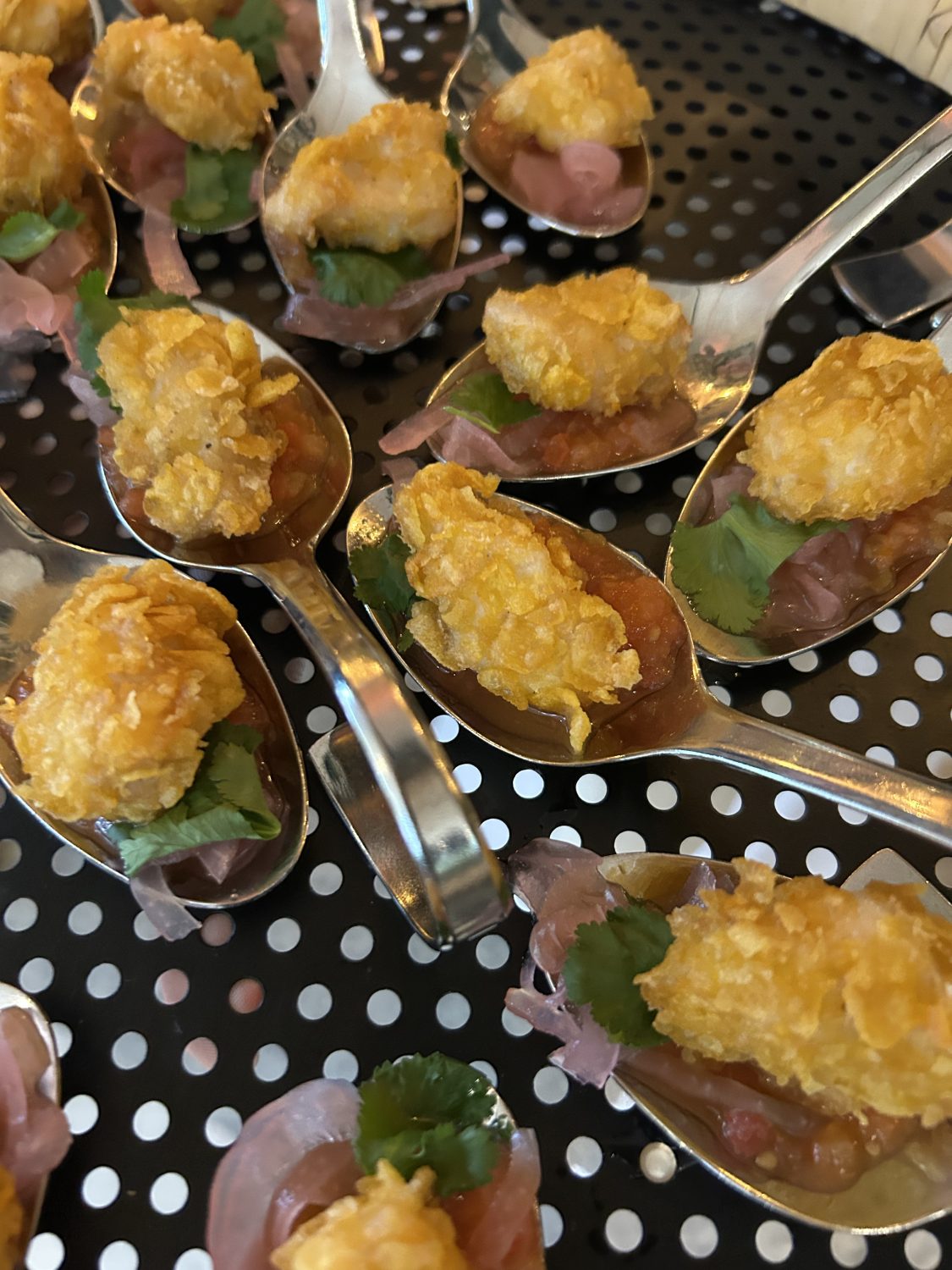 El cóctel tuvo lugar en el porche, fue uno de los grandes aciertos del día. Gracias a la climatización, el ambiente fue muy agradable, la música en directo se integró perfectamente, permitiendo disfrutar tanto de la gastronomía como del concierto. Las piezas del cóctel estaban deliciosas, los puestos bien distribuidos y ambientados, y el puesto de cervezas ,muy bien ubicado y siempre frías, fue especialmente comentado por los invitados.