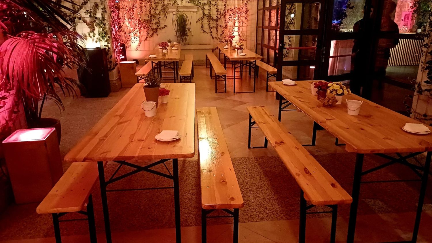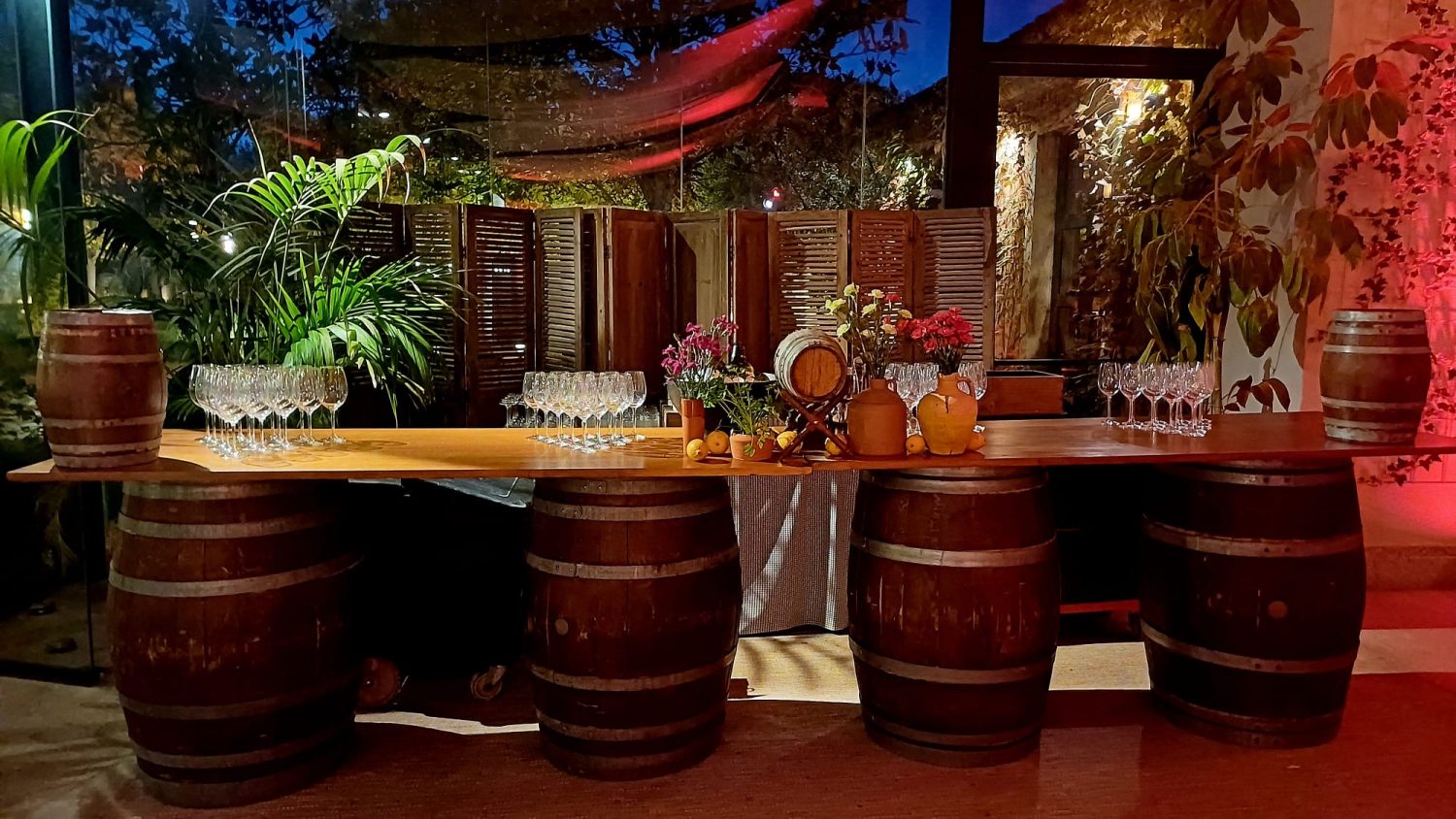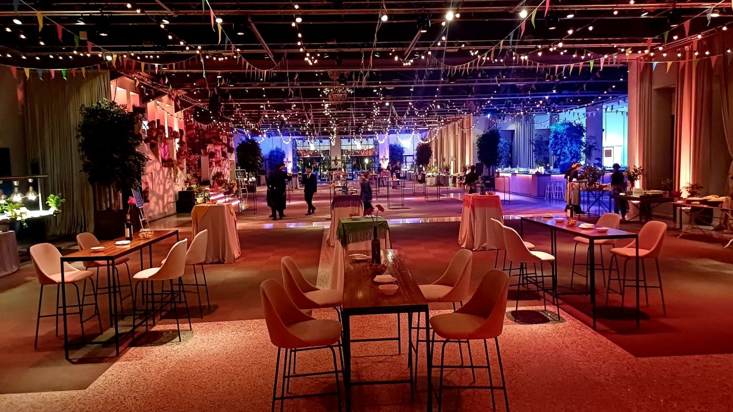 EF diseñó una distribución de espacios muy dinámica. Mesas altas iluminadas, zonas festivas con guirnaldas, rincones de inspiración andaluza con sillas de colores y una terraza interior con mesas corridas de madera ofrecieron a los invitados ambientes variados según el momento del evento.
